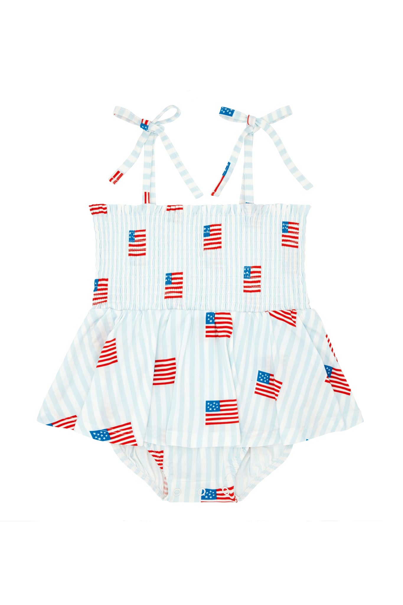 Sweet, festive, and made for the most memorable summer moments. The All American Smocked Twirl Romper features a beautifully smocked bodice with tie straps and a ruffle hem that flows into a flowy skirt overlay, all in a light blue and white stripe base scattered with American flags. Crafted from our softest viscose from bamboo, it's the coziest, most adorable way to celebrate the 4th.