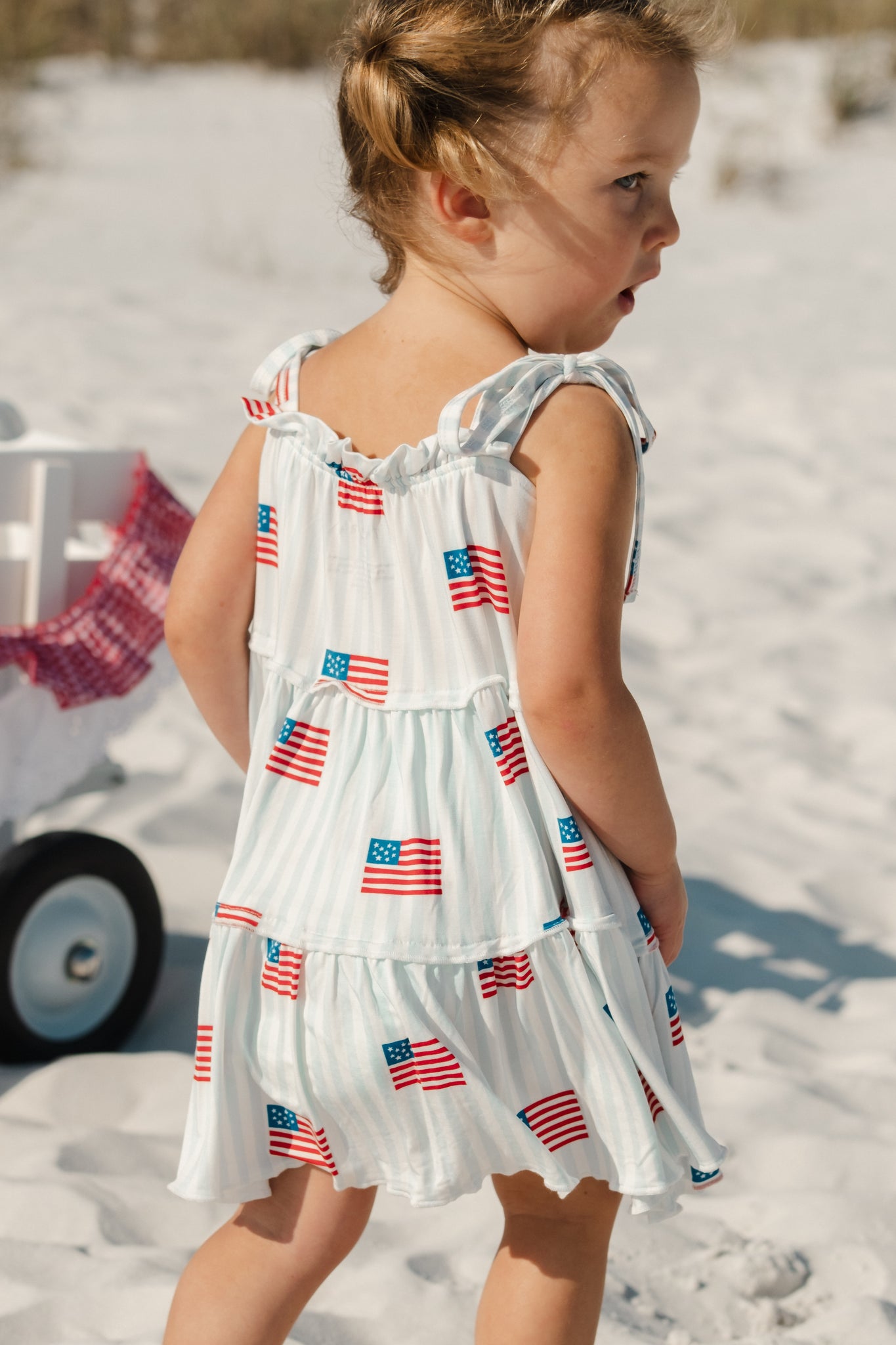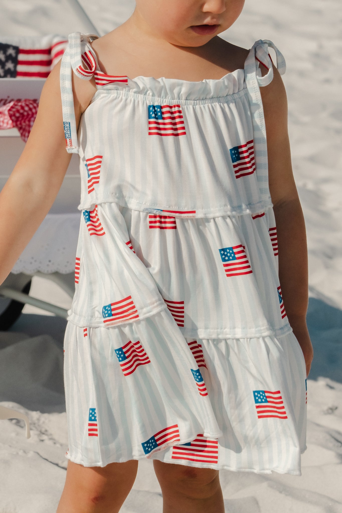 The dress that was made for the 4th of July. The All American Tiered Twirl Dress features a gathered ruffle neckline, adjustable tie straps, and a three-tiered skirt that's as fun to twirl in as it is to wear, all in a light blue and white stripe base scattered with American flags. Crafted from our buttery-soft viscose from bamboo, she'll stay cool and comfortable from the parade straight through to the fireworks.