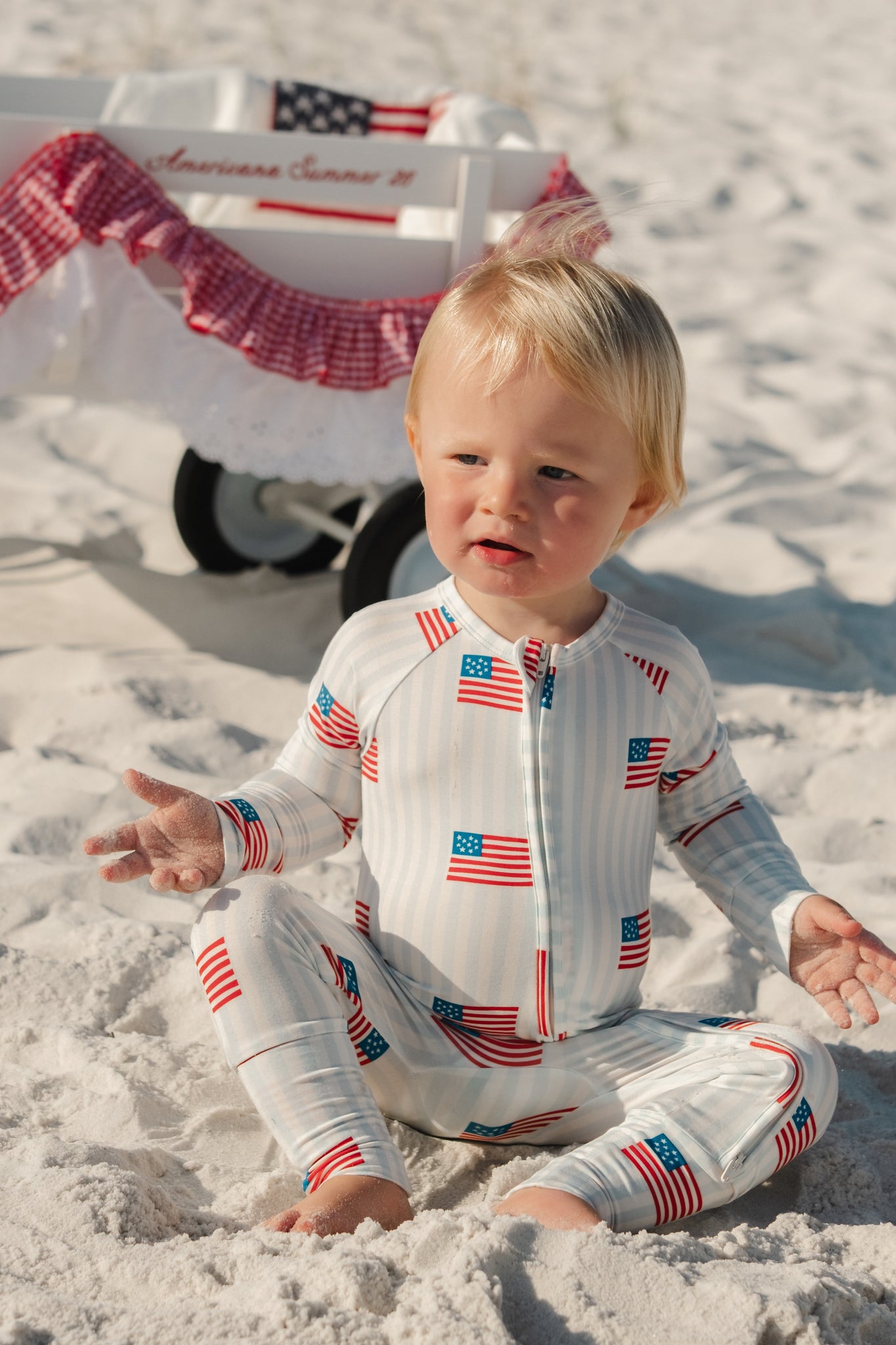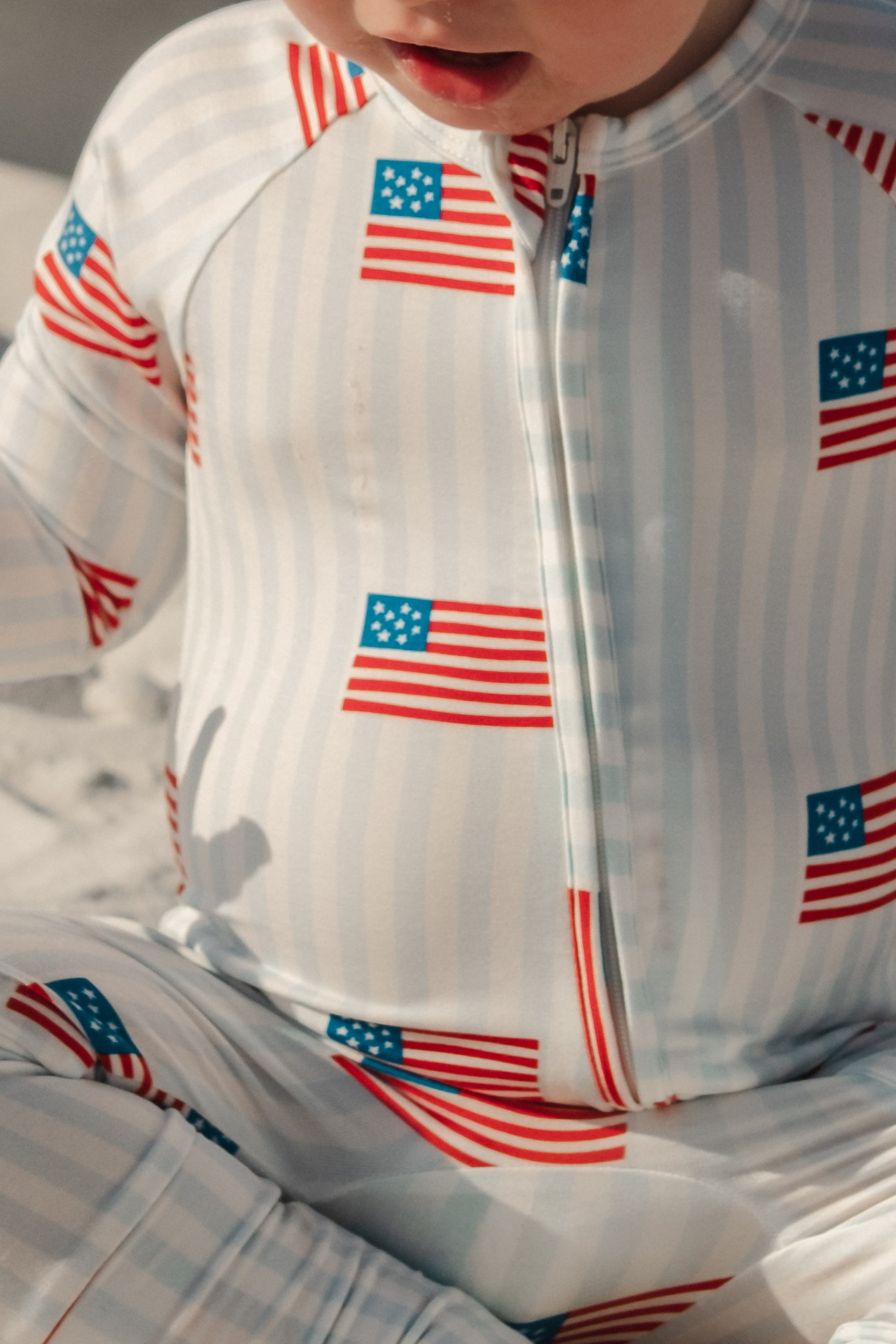 As classic as it gets. All American features a light blue and white stripe base scattered with waving American flags in red, white, and blue — the most patriotic print in the collection and the perfect way to celebrate summer. This zip-up romper is crafted from our buttery-soft viscose from bamboo, keeping little ones cozy and comfortable from bedtime snuggles to lazy 4th of July mornings.
