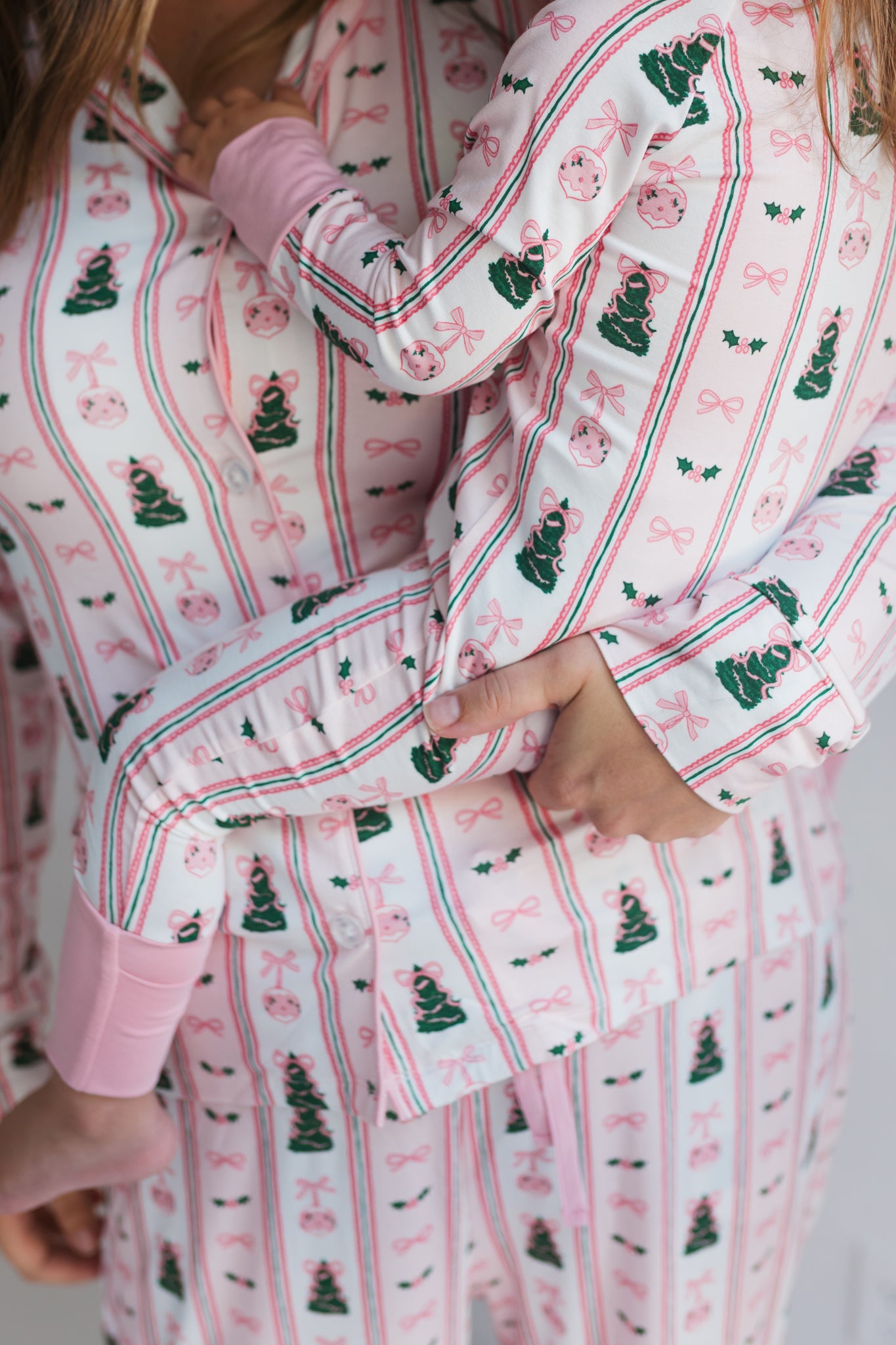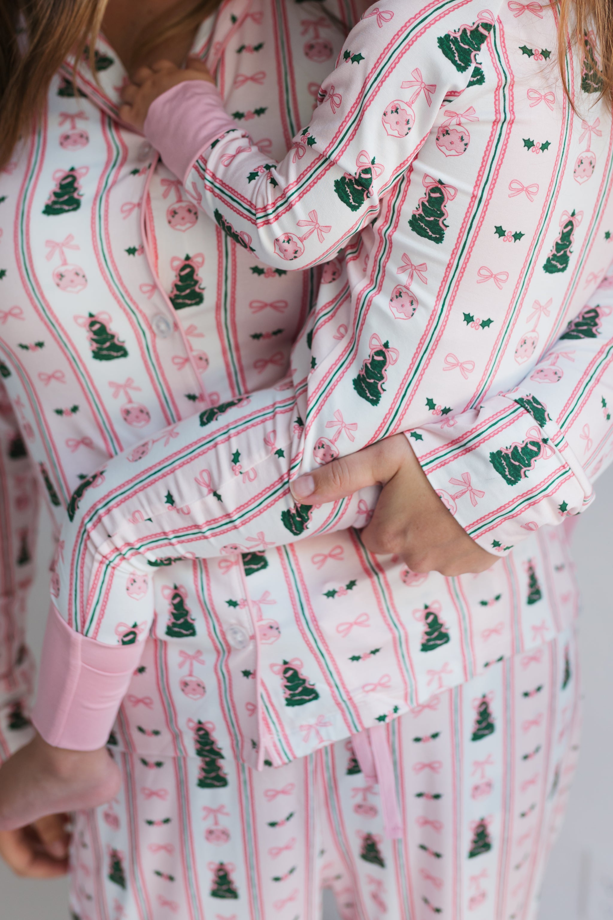 Celebrate the season with a playful twist in our Pinkmas print. Featuring rows of dainty pink ribbons, holly sprigs, festive ornaments, and Christmas trees wrapped in bows, this charming design puts a whimsical spin on holiday classics. Crafted from our signature buttery-soft viscose from bamboo, these matching Christmas pajamas are made for cozy nights, Christmas morning excitement, and picture-perfect family traditions.