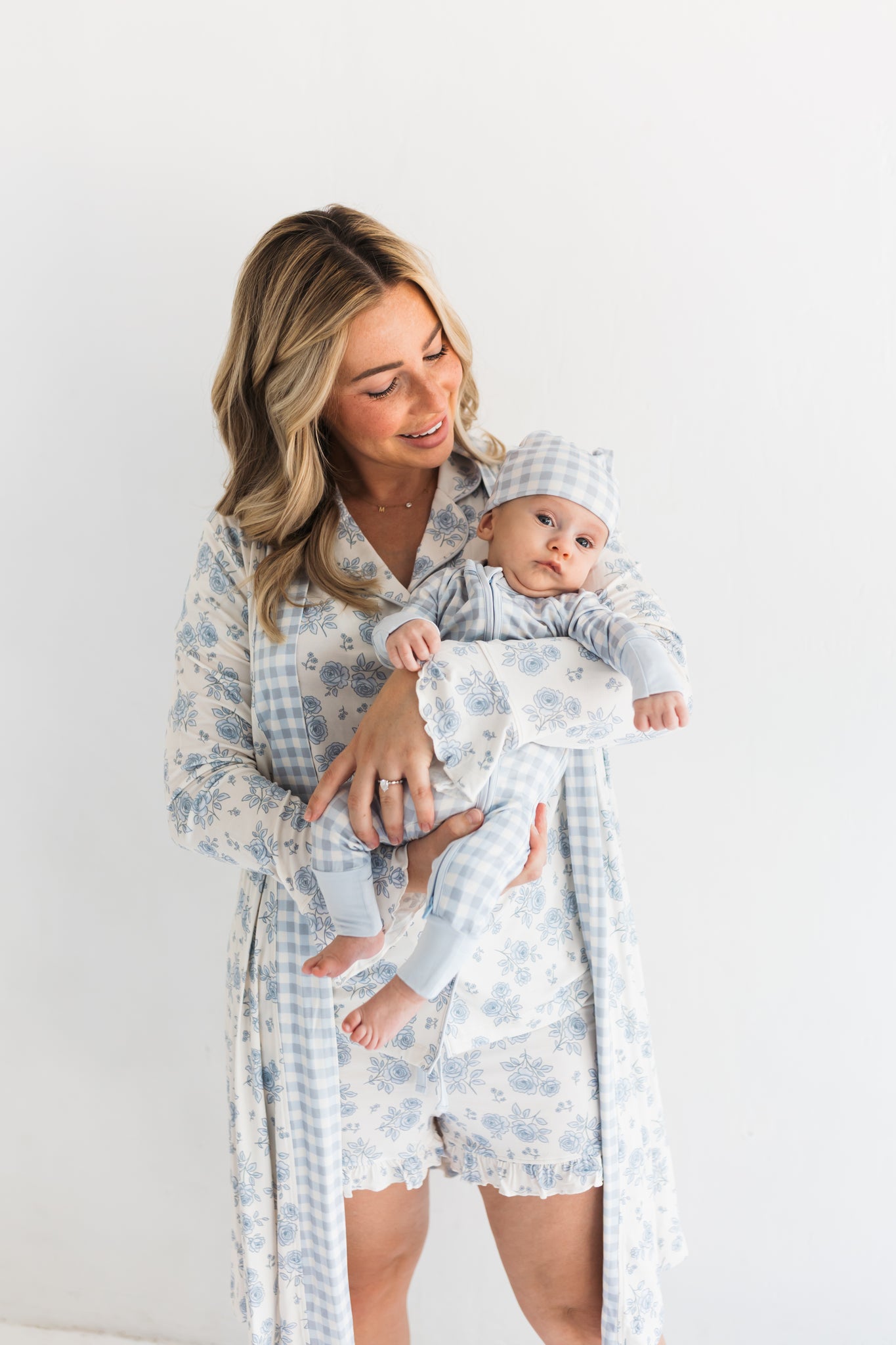 A soft beginning for baby, and a gentle comfort for you. The Gingham Garden collection is thoughtfully designed for the earliest days, whether you’re packing your hospital bag or settling into those first quiet weeks at home. Featuring timeless gingham checks and delicate rose blooms in soft blush and powder blue, each piece is crafted from buttery-soft viscose from bamboo for breathable, soothing comfort.