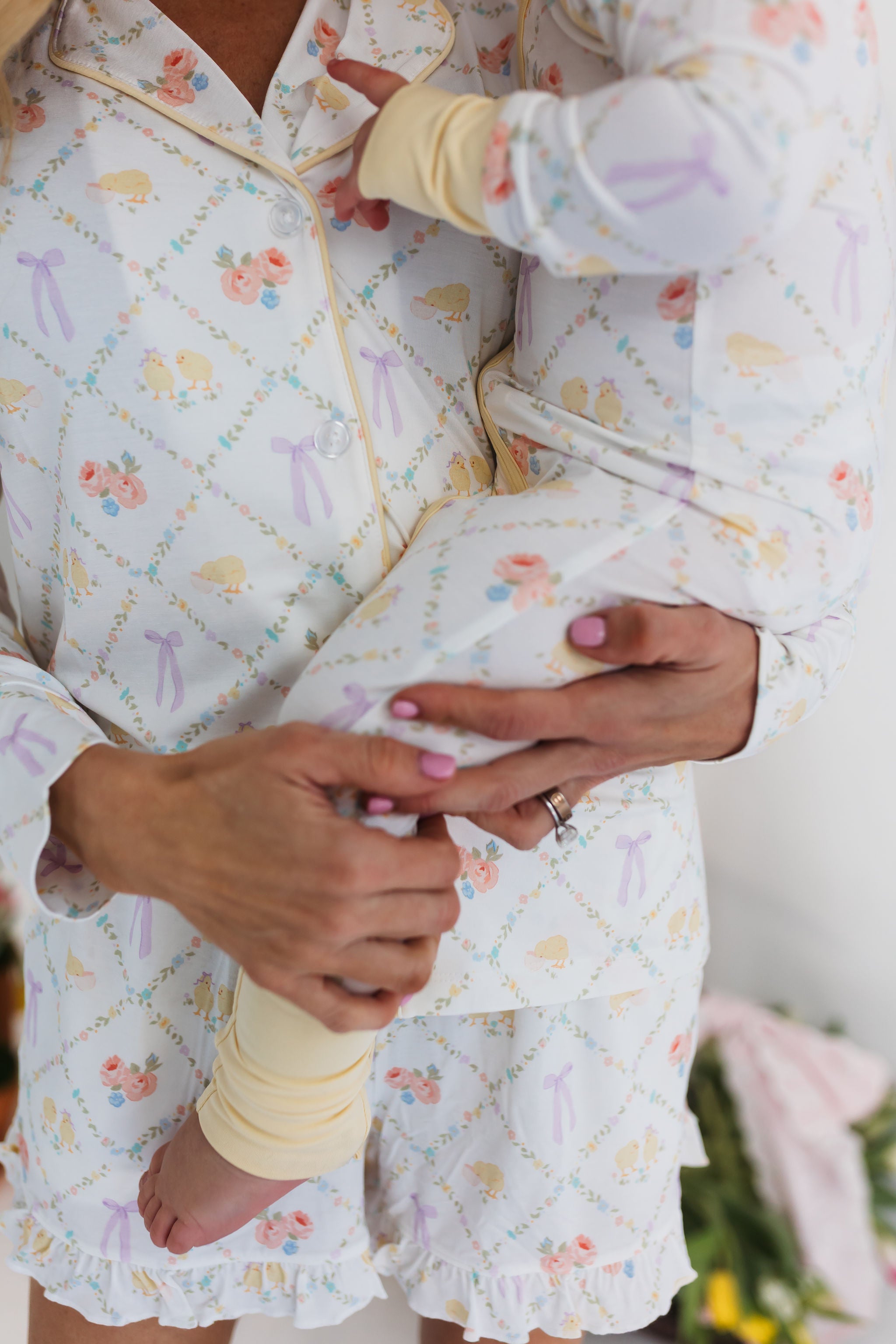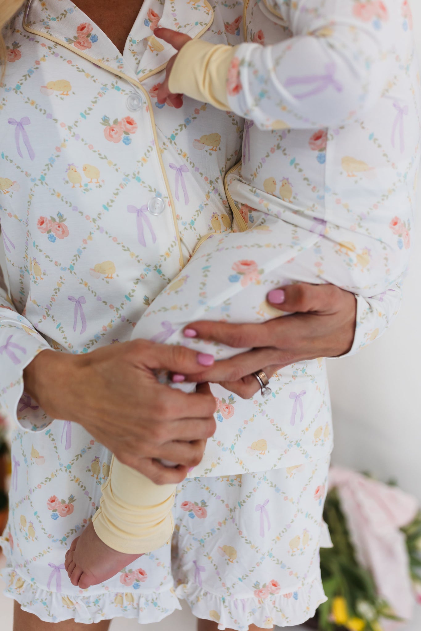 Peep and Petal is springtime sweetness wrapped up in the softest little set. Delicate florals, pastel bows, and tiny fluffy chicks come together in a print that feels straight out of a storybook. It is soft, feminine, and full of those little details that make Easter morning feel magical.