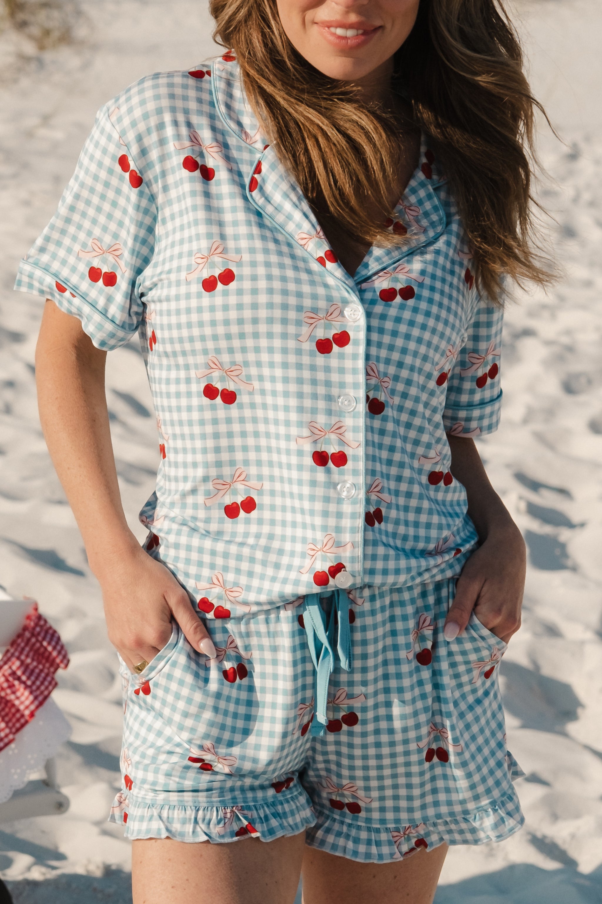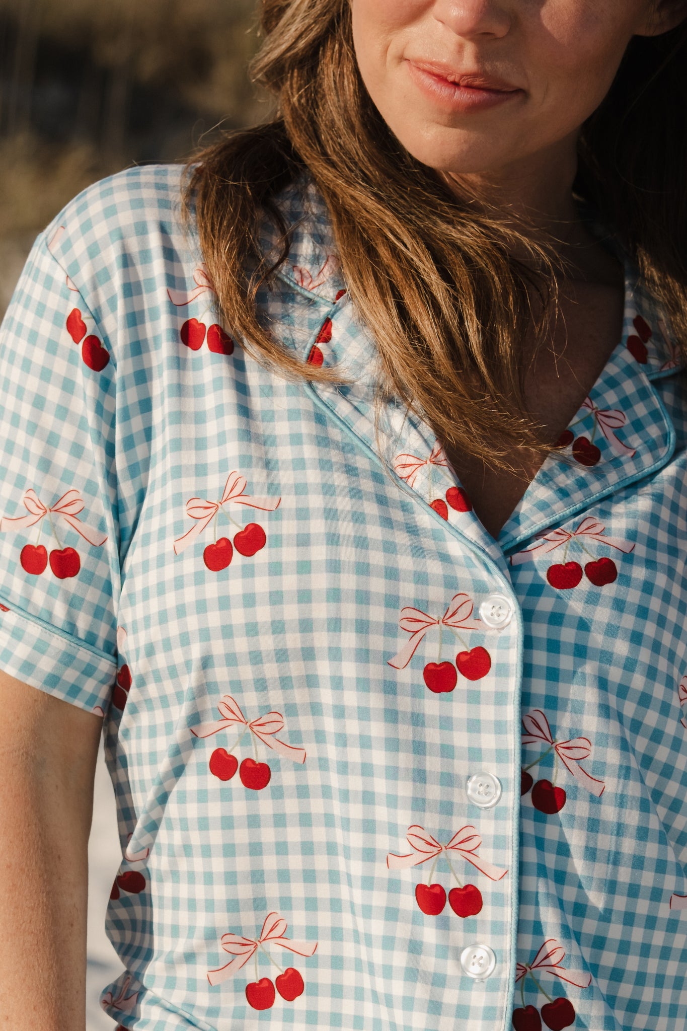 Life is just better in Little Cherry. This women's short set pairs a light blue gingham base with bold red cherry clusters tied with pink bows in a relaxed, easy silhouette made for real summer living. Match your littles, sip your coffee, and enjoy every slow summer morning in buttery-soft viscose from bamboo that keeps you cool and comfortable all day long.