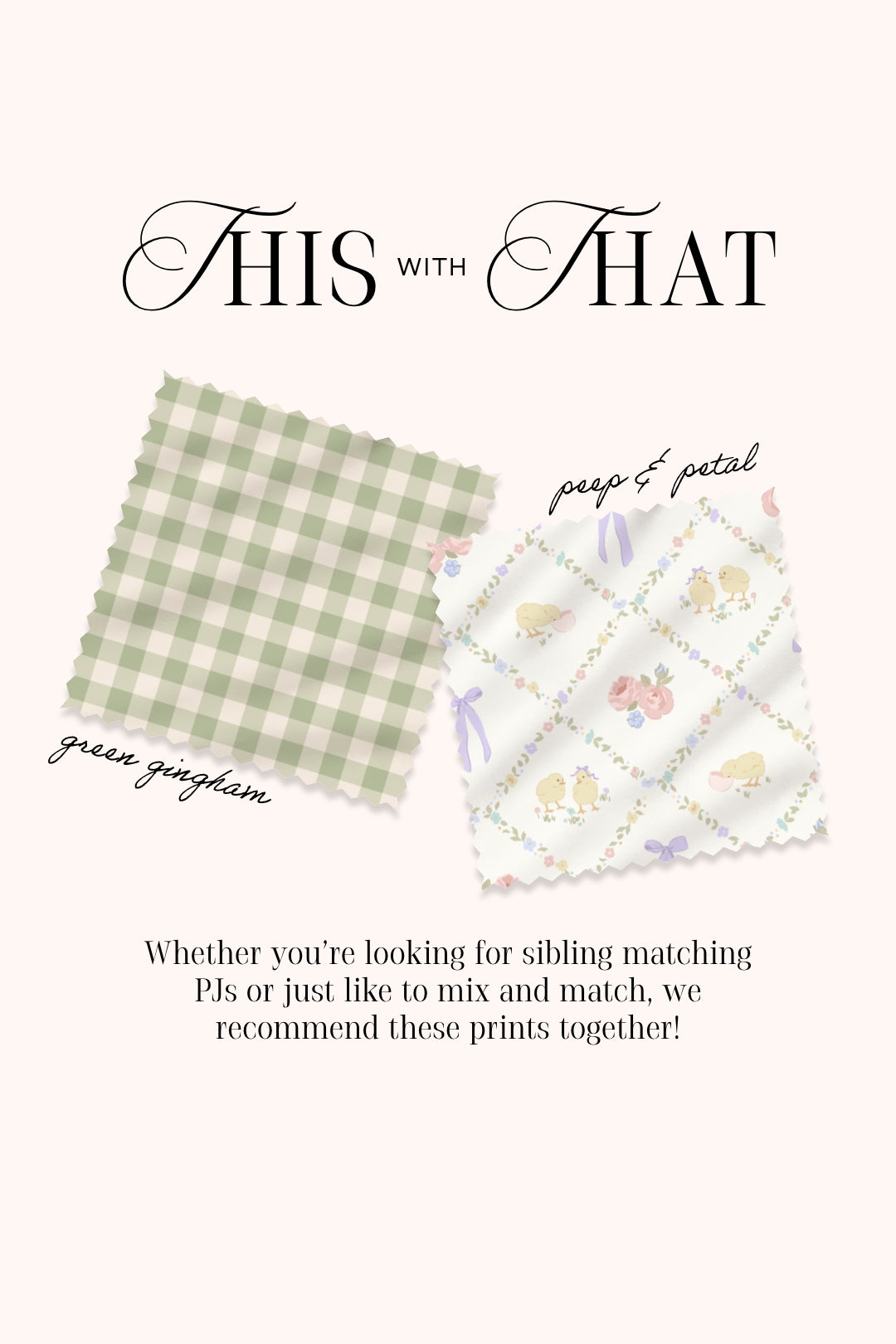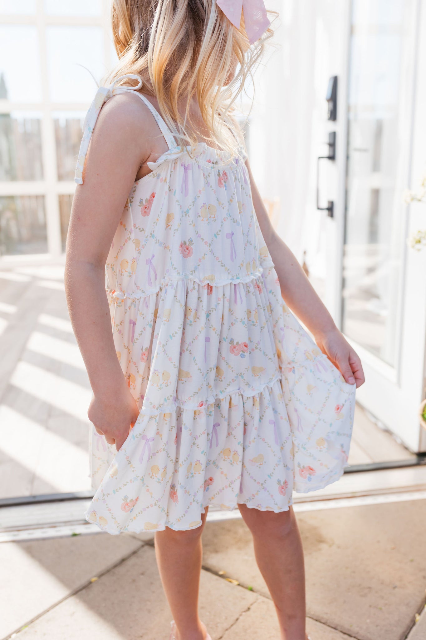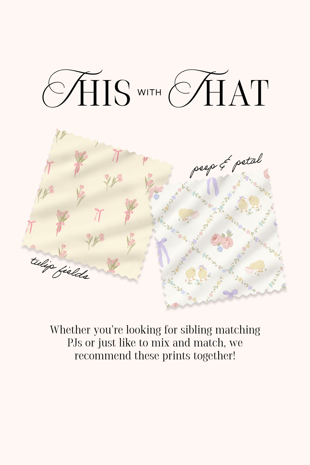 Peep and Petal is springtime charm made for twirling, brunch dates, and Easter egg hunts in the sunshine. Featuring delicate florals, pastel bows, and the sweetest little chicks, this heirloom inspired print feels soft, timeless, and perfectly dressed up for the season.