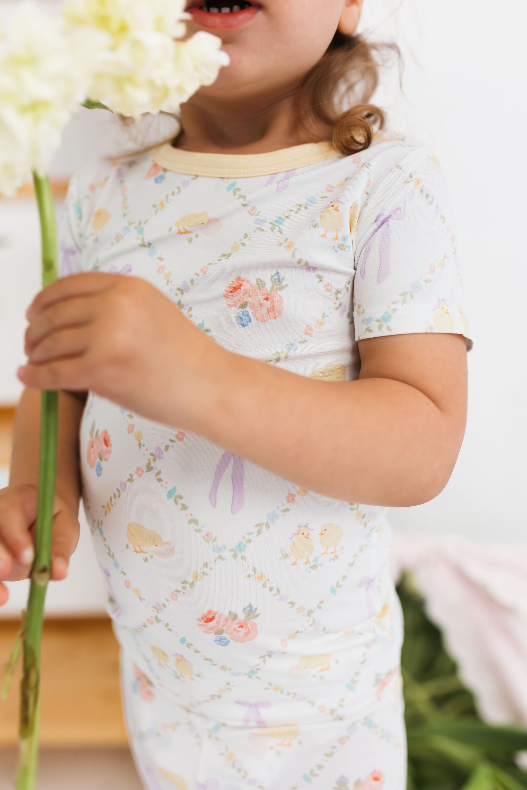 Peep and Petal is springtime sweetness wrapped up in the softest little set. Delicate florals, pastel bows, and tiny fluffy chicks come together in a print that feels straight out of a storybook. It is soft, feminine, and full of those little details that make Easter morning feel magical.
